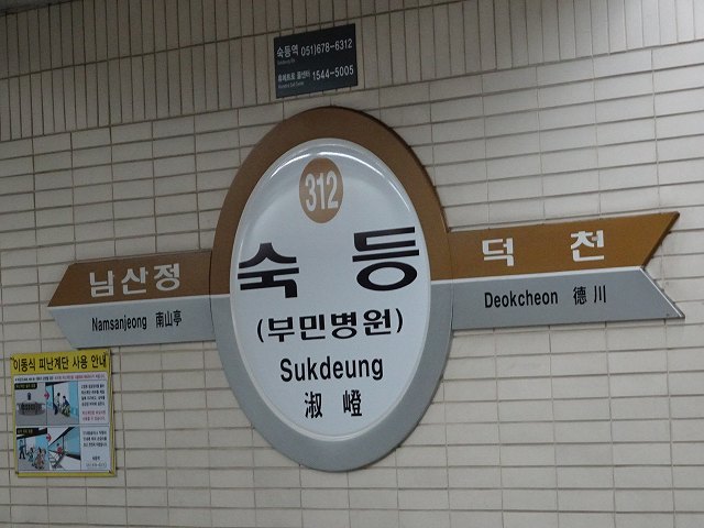 - 釜山都市鉄道3号線 숙등 312(漢字表記:淑嶝/スクトゥン駅)