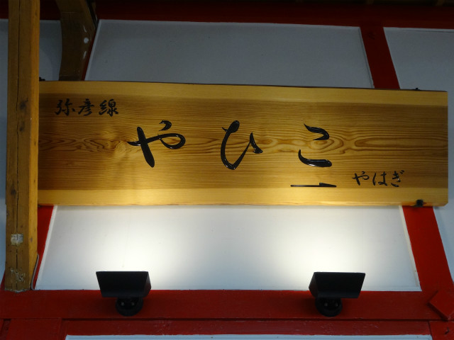 - 近くにある彌彦神社(いやひこじんじゃ)は、古事記に記載がある由緒ある大きな神社です。駅名標・駅舎もかっこいい。