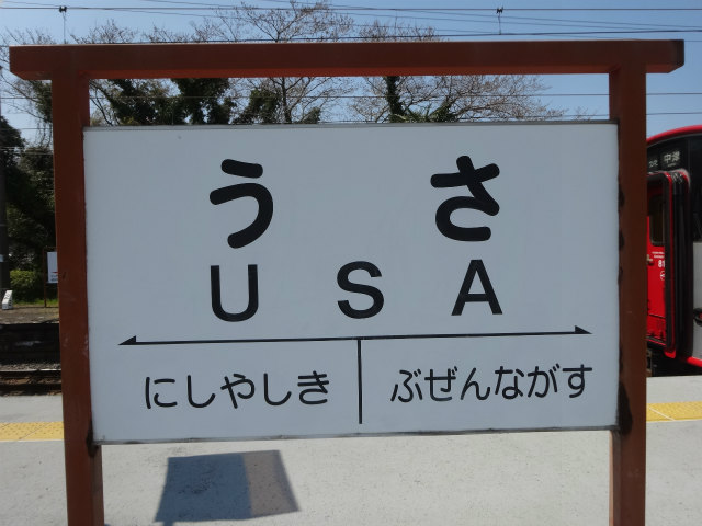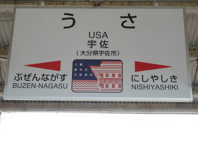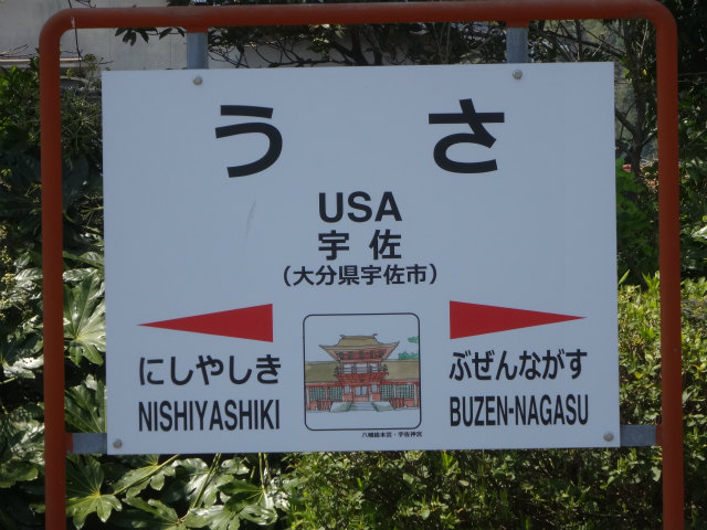 - USAであることがPRポイントの宇佐市。駅名標のシンボルマークも狙いすぎです。2020年東京オリンピックではモンゴルのホストタウンらしい。そこはアメリカじゃねえのか。さすがにダジャレで決めるのは失礼すぎるか。