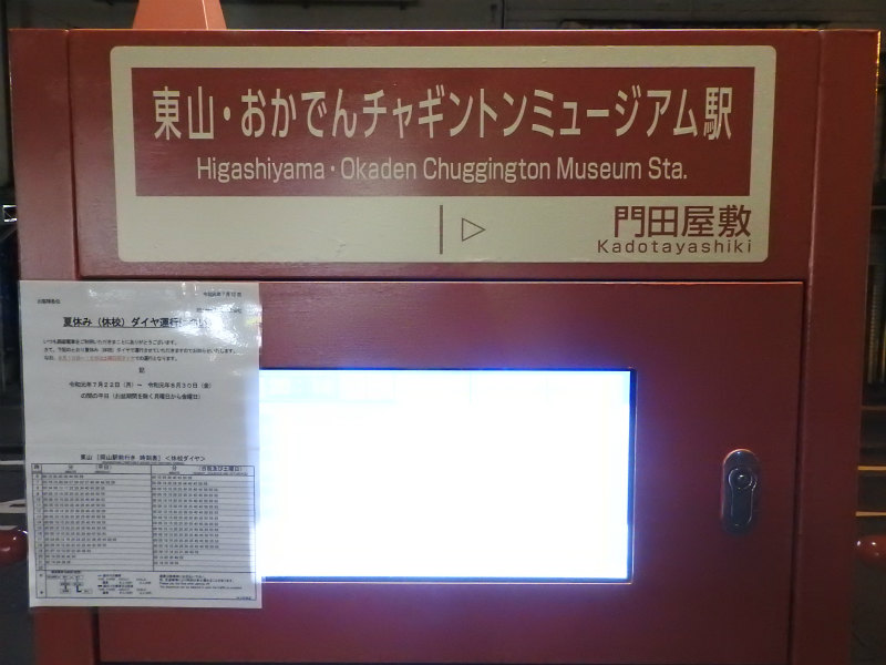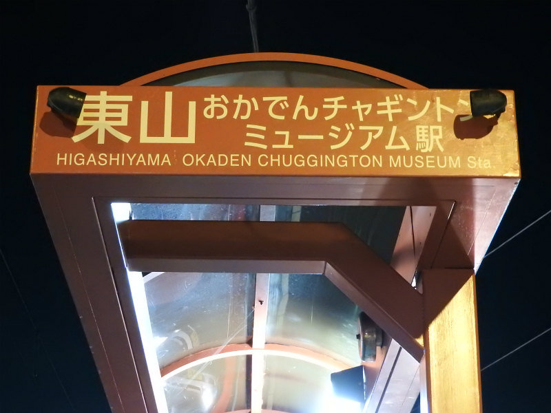 - 終点。車庫があります。以前の停留場名は「東山」でしたが、こんなふざけた駅名になってしまった。停留場名の正式名称に「チャギントン」は入りませんが、「駅」は入ります。