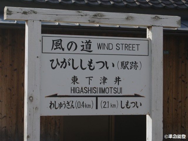 - こんな駅があったわけではありません。廃線跡の「風の道」に新規に設けられた駅名標風のものです。東下津井駅跡から、少しだけ下津井駅跡方面に歩いたところにあります。駅名標から東下津井駅が消されている。