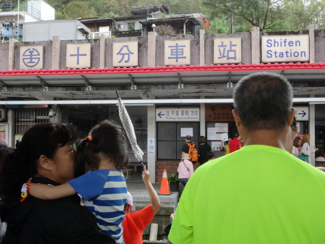 - 十分瀑布は「台湾のナイアガラ」とも称される滝。駅北側には線路のすぐそばまで商店が立ち並び、商店街の中を列車が走るようです。列車交換のため結構長いこと止まってました。人が多いこと多いこと。