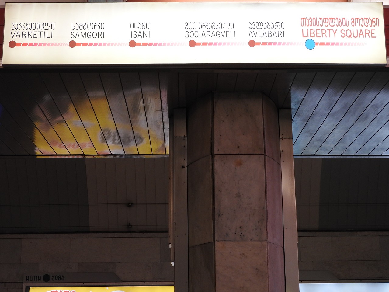 - 自由広場駅。なんとなく想像が付くと思いますが、旧「レーニン広場(ლენინის მოედანი)」駅です。ムタツミンダ地区にあり、ムタツミンダ公園へ行くケーブルカーはここが最寄駅。
